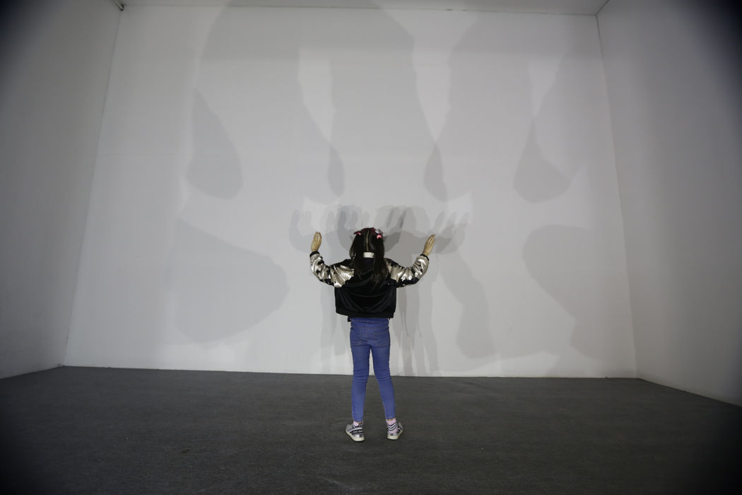 Several spotlights project light on a white wall, however these lights only become perceptible when visitors enter and move across the space, blocking the light source and filling the void of the room with the presence of their shadows. The moving shadows of visitors create a sort of choreography and stretch and contract in tones ranging from grey to black, varying based on the movements of bodies in the space. Differences in race, religion, age, and class are flattened in this work as details used to identify individuals are reduced to moving outlines, and we become more aware of the present moment and the patterns we can build by engaging with people around us.